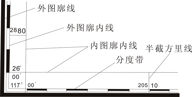 ① 1:20万比例尺地质图件中既表示经纬网,又表示公里网。除在四个图廓点,注记相应的经纬度外,在内、外图廓之间加绘经纬线并注记。南北内、外图廓之间以15º间隔加绘经线;东西内、外图廓之间以10º间隔加绘纬线。为了用图方便,在外图廓内线上还要表示“分度带”,可直接根据分度带加密经纬线网;图廓内绘制方里网线并在内、外图廓间注记方里网数值,其格式见图。