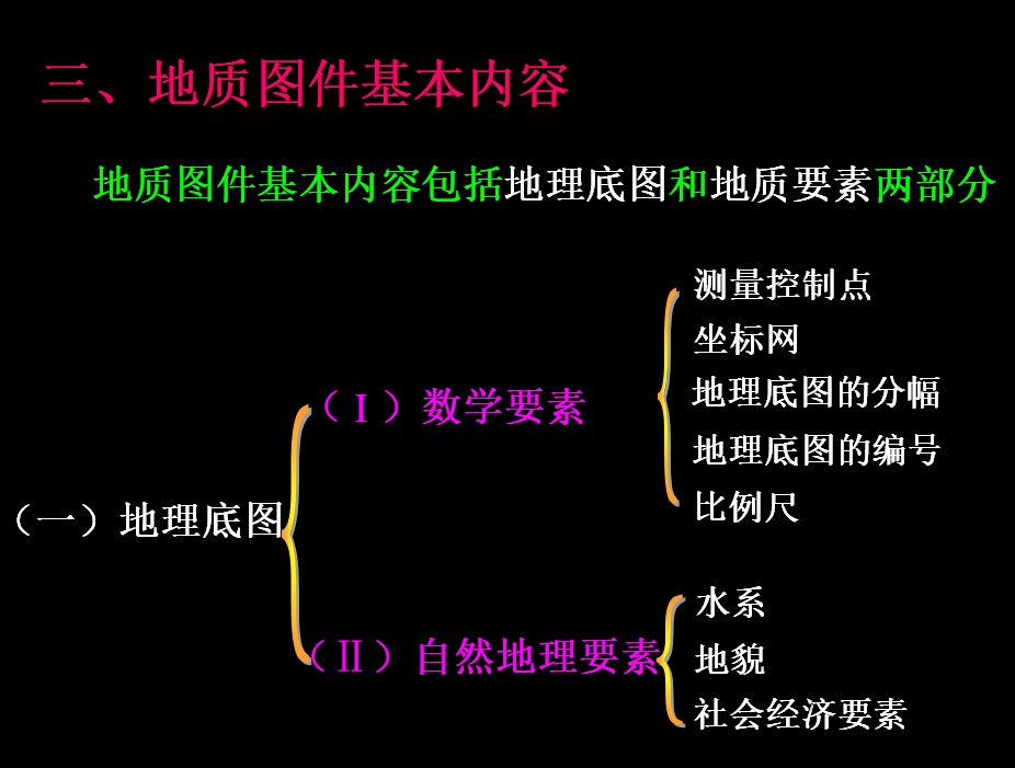 地质图:是指用一定的符号、颜色和花纹将某一地 区各种地质体和地质现象(例如各种地层、岩体、构造、化石、矿床形态等的产状、分布、形成时代及相互关系)按一定比例尺综合概括地投影到地形底图上的一种图件。
