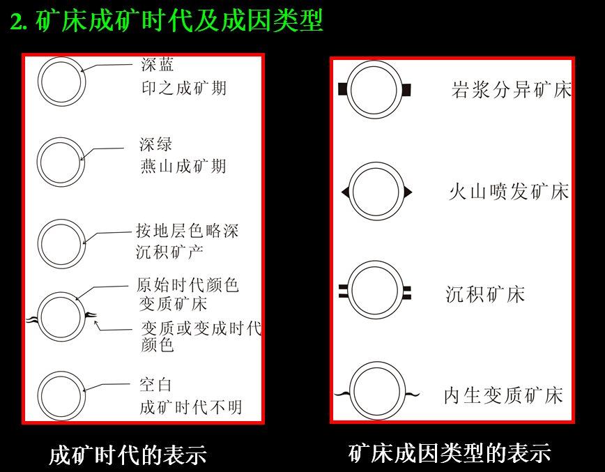 矿产符号可以表示矿产的种类及规模、成因类型、成矿时代等内容。
