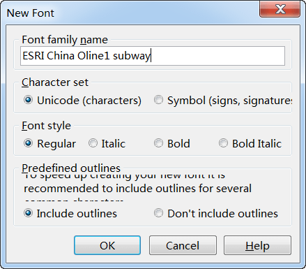 4.单击File->New, 弹出New Font窗口,如下图,将字体家族名称命名为“ESRI China Oline1 subway”;